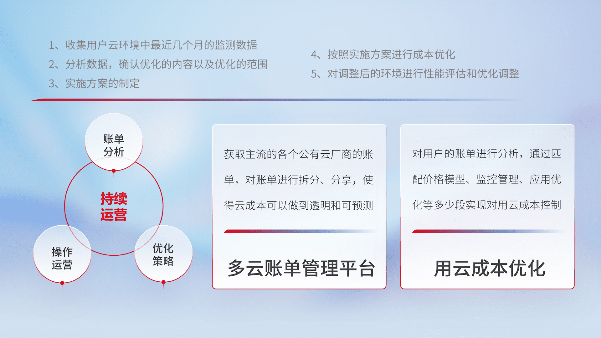通过多云纳管,,,,以统一的资源数据模型把客户的云资源进行抽象和封装,,,,进而实现对多云资源的统一操作,,,,保障云资源管理的可靠性、、稳定性与可用性。。。量身定制化运维内容,,,,配置、、、开发运维、、、补丁管理、、、、备份、、监控、、、认证和访问管理、、、、审计和日常巡检等,,,,保障在用云过程中的可靠度,,,,稳定度以及高可用率。。。。